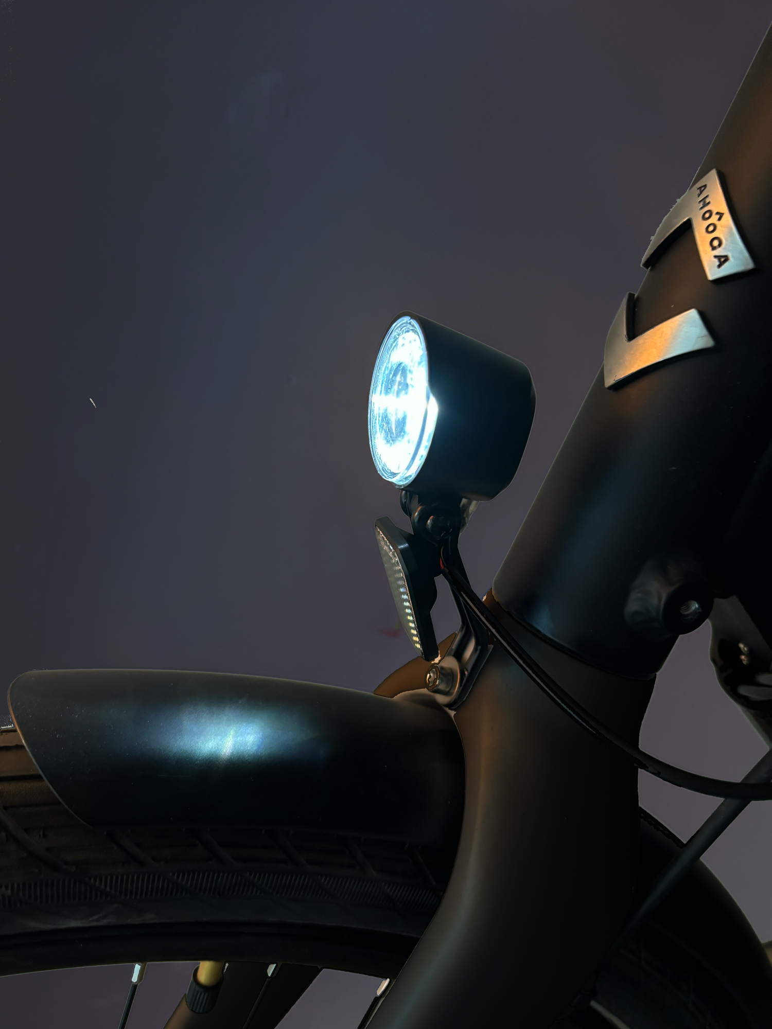 Spanninga Arco lights (80-30 lumens front/rear) . With these lights, the ride is easier and safer.